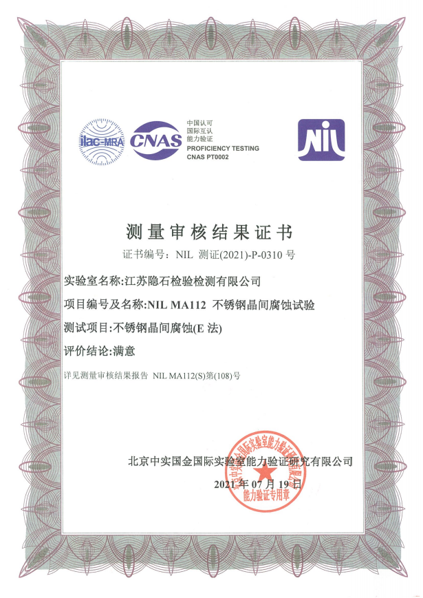 近日,江蘇隱石檢驗檢測有限公司取得了由北京中實國金國際實驗室能力驗證研究有限公司(國內具有能力驗證提供者資格的第三方獨立法人機構,簡稱“中實國金”)頒發的不銹鋼晶間腐蝕檢測審核合格證書。由于測量審核是中國合格評定國家認可委員會(CNAS)判斷國家認可實驗室能力的重要技術依據,隱石檢測根據認可要求參加了中實國金組織的測量審核,檢測中心的技術人員通過對中實國金發送的貴金屬盲樣進行認真、細致的檢測分析,得出了檢測結果,并提交給能力驗證機構。中實國金經審核評價給出...