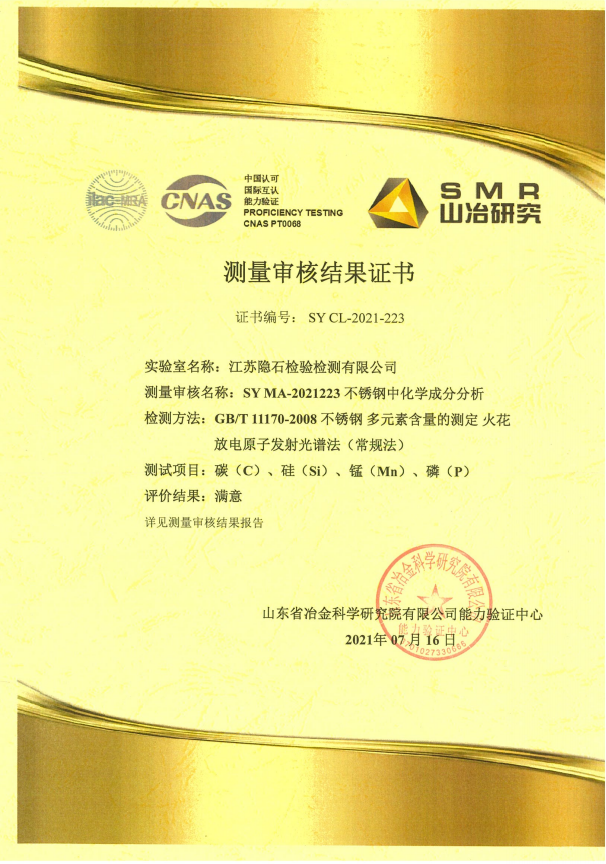 近日,江蘇隱石檢驗檢測有限公司取得了由山東省冶金科學研究院有限公司能力驗證中心頒發的不銹鋼成分檢測審核合格證書。由于測量審核是中國合格評定國家認可委員會(CNAS)判斷國家認可實驗室能力的重要技術依據,隱石檢測根據認可要求參加了中實國金組織的測量審核,檢測中心的技術人員通過對山東冶金送的貴金屬盲樣進行認真、細致的檢測分析,得出了檢測結果,并提交給能力驗證機構。中實冶金經審核評價給出滿意的結論,檢測中心順利通過了本年度測量審核。作為金屬成分檢測能力國家認可的...