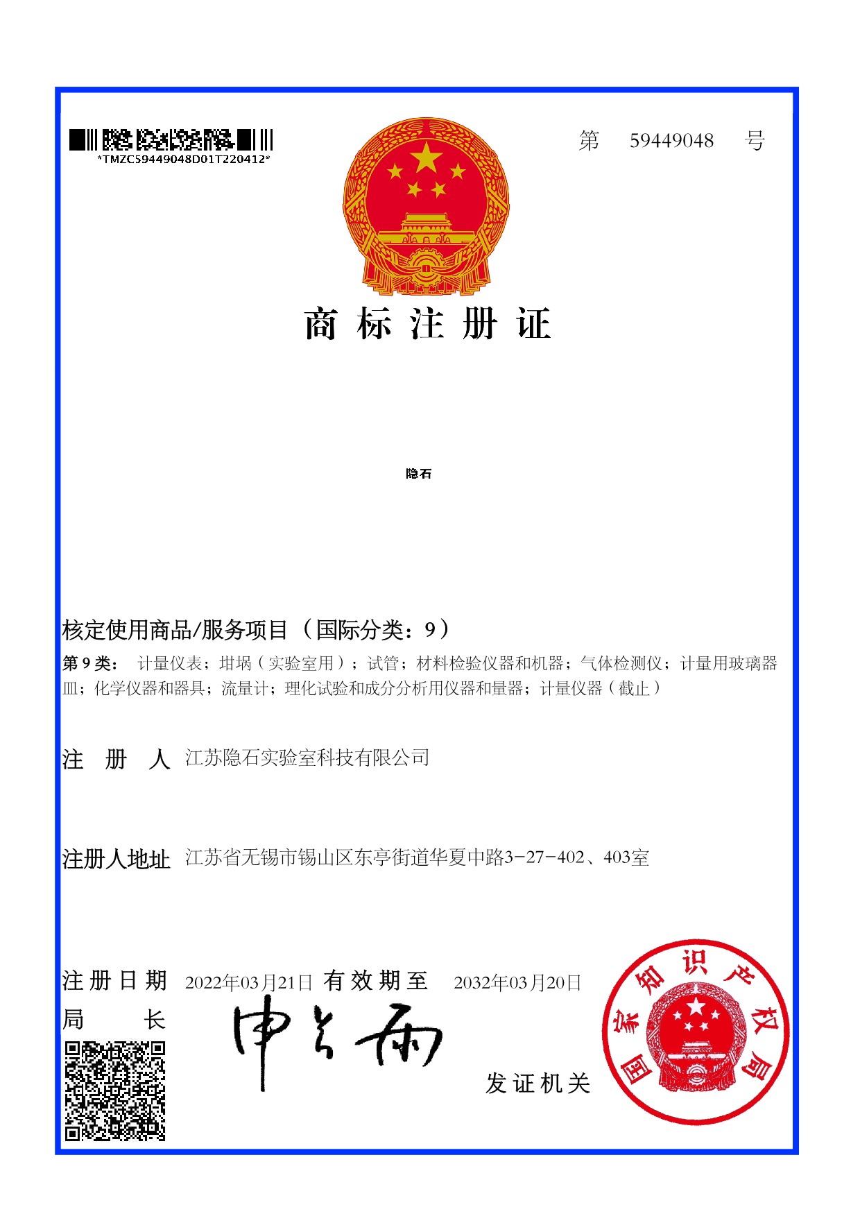 近日江蘇隱石實驗室科技有限公司申請注冊“隱石”等商標,獲得國家知識產權局核準注冊成功,此次申請的商標包含第九類:計量儀表;坩堝(實驗室用);試管;材料檢驗儀器和機器;計量儀器;氣體檢測儀;計量用玻璃器皿;化學儀器和器具;流量計;理化試驗和成分分析用儀器和量器,第四十二類:產品質量檢測服務;技術研究咨詢;技術研究;機械研究;質量控制;科學實驗室服務;科學研究;工程設計服務;產品質量評估;產品質量檢測;技術開發(fā)領域的咨詢服務;機械制造的研究;產品安全檢測服務;進行化學分析;化學分析服務;化學研究和分析;化學服務;化學研究;化學分析;產品測試;原材料測試;材料檢測咨詢;材料檢測;材料測試。