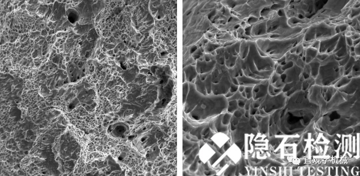 韌窩的尺寸和深度與材料的延展性有關(guān),而韌窩的形狀也同受到的破壞應(yīng)力有關(guān)。因此,對(duì)于斷口面上吻合部位的韌窩幾何形狀、尺寸和深度進(jìn)行分析,就可以確定斷裂時(shí)所在部位的應(yīng)力狀態(tài)和裂紋擴(kuò)展的方向,并可對(duì)材料的延展性進(jìn)行評(píng)價(jià)。